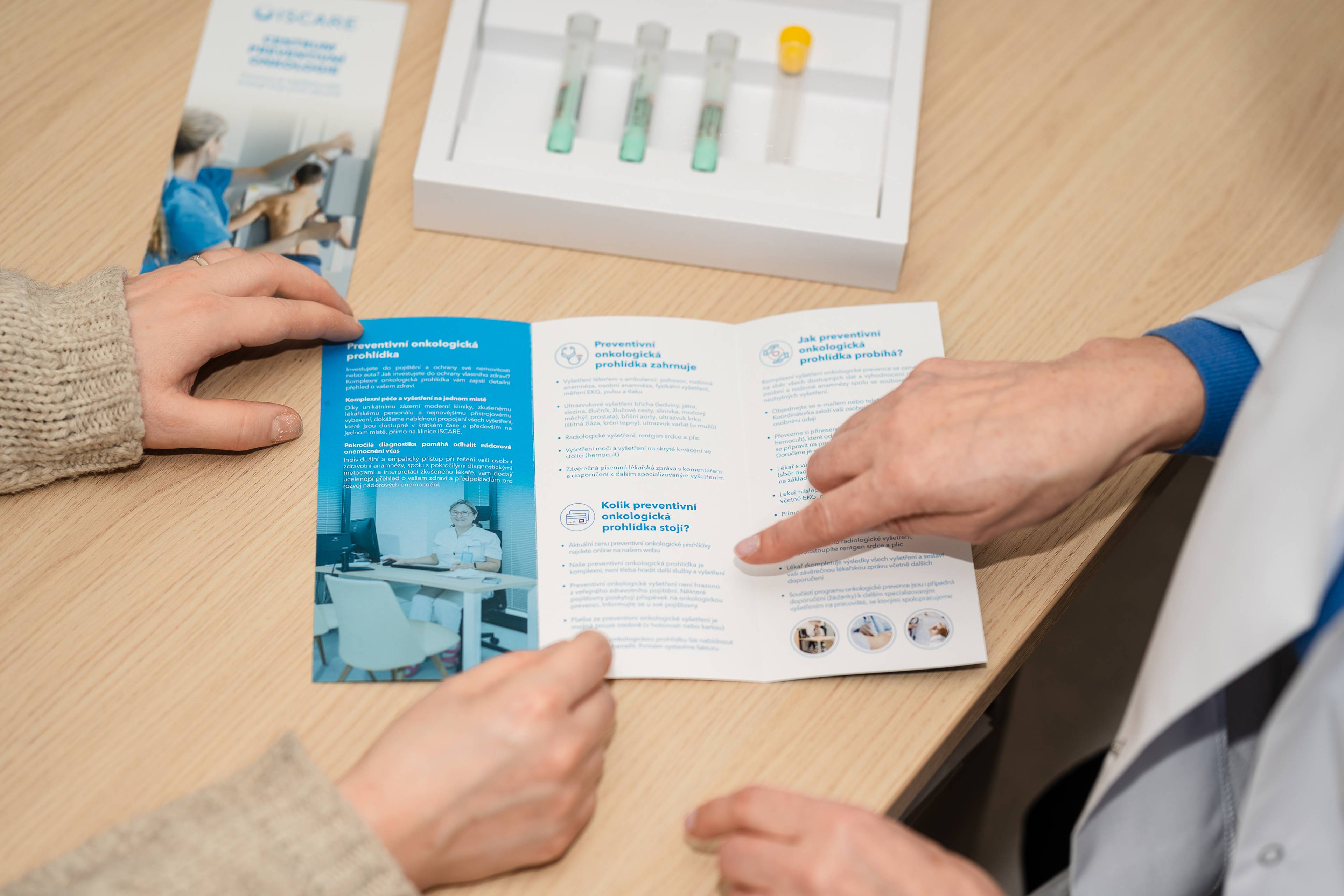 - Poté si převezme přinesené vzorky moči (zkumavku lze zakoupit v lékárně) a stolice (set pro hemocult, který od nás obdržíte spolu s pokyny předem poštou).